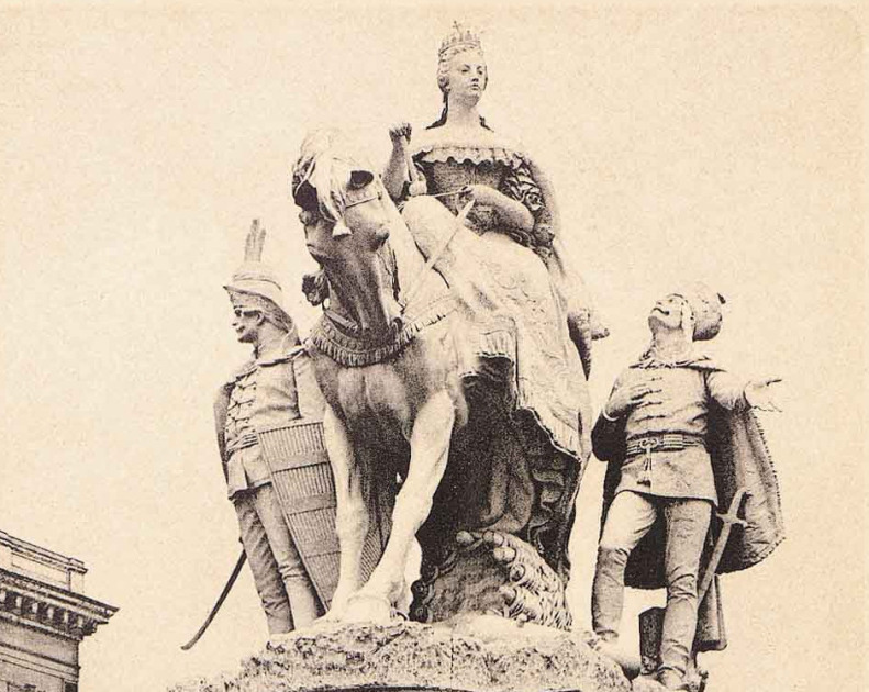 Po jej ľavici stojí uhorský šľachtic v slávnostnom odeve, ktorý má jednu ruku položenú na srdci a druhou ukazuje dookola a naznačuje, že je pripravený za svoju panovníčku obetovať „život a krv”. Po pravici Márie Terézie stojí druhý uhorský šľachtic, držiaci v ruke meč a štít a odhodlaný chrániť kráľovnú a krajinu. Súsošie vytvoril bratislavský rodák Ján Fadrusz a slávnostne ho odhalili v roku 1897 v prítomnosti cisára Františka Jozefa. Skvost niekdajšieho dunajského nábrežia v októbri 1921 zničili českí legionári.