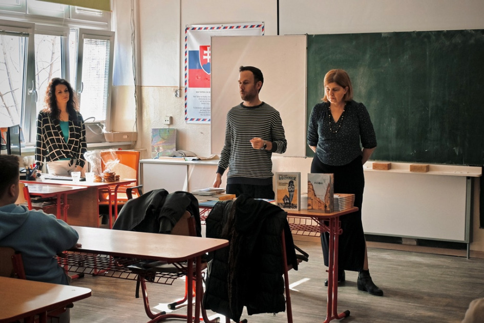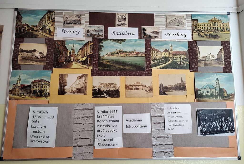 Pani učiteľka Kopálová hosťom prezentovala peknú trojjazyčnú nástenku, tvorenú okrem iného obrázkami z nášho Prešporského kalendára a dozvedeli sme sa aj takú zaujímavosť, že Základnú školu Milana Rastislava Štefánika kedysi navštevoval slávny bratislavský rodák Július Satinský.
