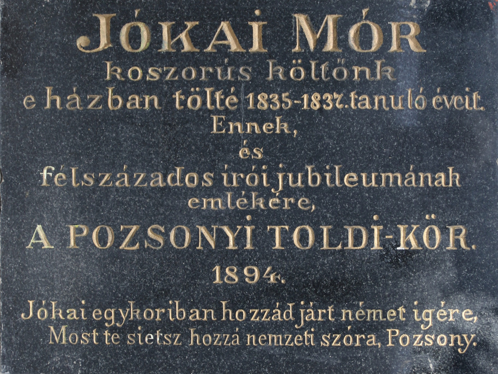 V roku 1893 sa na priečelí jedného z domov na tejto ulici objavila čierna pamätná tabuľa, ktorá miestnych informovala, že tu, v dome baróna Lepela, býval mladý Jókai, keď ho v roku 1835 rodičia poslali na výmenný študijný pobyt k profesorovi evanjelického lýcea Samuelovi Zsigmondymu, aby sa naučil po nemecky. Zostal tu do roku 1837, kým Zsigmondyho syn Viliam, ktorý sa neskôr preslávil ako vŕtač artézskych studní, býval u Jókaiovcov v Komárne. „Za toto obdobie sa Jókai pod vedením profesora Tobiáša Gottfrieda Schröera naučil dobre po nemecky a po latinsky. Na Jókaiho osobnostný rozvoj a život mal Prešporok výrazný vplyv – čo tu videl a čo sa tu naučil, neskôr rozhodujúcou mierou determinovalo jeho pohľad na svet. A mnoho prešporských spomienok sa objavuje aj v jeho románoch.“