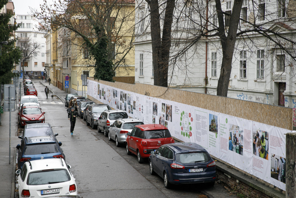 Exteriérovú výstavu sa zvyčajne každý snaží navštíviť počas dňa – najmä v zime, keď sa už o pol piatej popoludní stmieva. Táto výstava má však jednu veľkú výhodu: je na nej čo objavovať za svetla i za tmy. Určite sa oplatí zastať aj na rohu Panenskej a Štetinovej ulice, lebo na požiarnom múre dvoch domov „bežia“ filmové zábery z desiatich ročníkov Dobrého trhu, ktorého neoddeliteľnou súčasťou bol aj stánok s publikáciami OZ Bratislavské rožky.