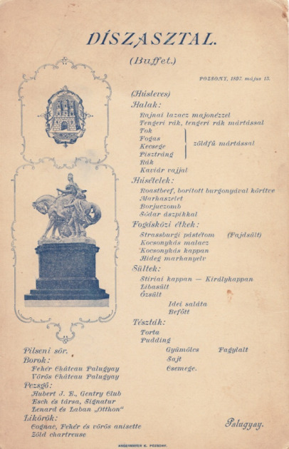 „Kapún v rôsole, údená šunka v aspiku, pácovaný jazyk alebo sviečkovica s prílohou. Ryža crème, mandľový puding, šalát Esterházy a miešaný kompót. Biere de Pilsen, rumunský punč, červené Château Palyugyay a Hubert J. E., Gentry Club.“ Zdá sa, že to bol skvelý výber…