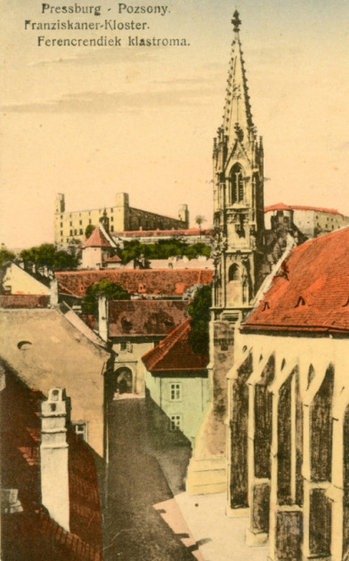 Pohľad z Farského ulice na časť Esterházyho paláca začiatkom 20. storočia.
