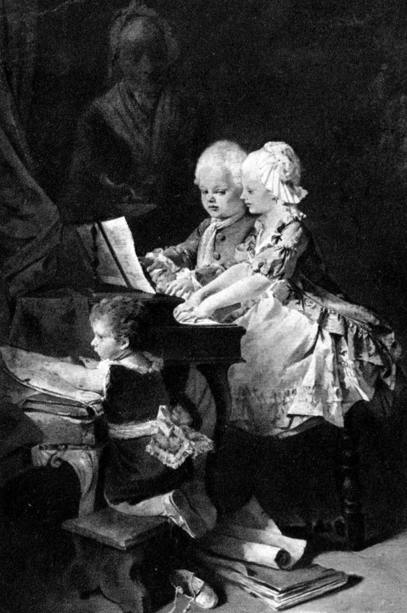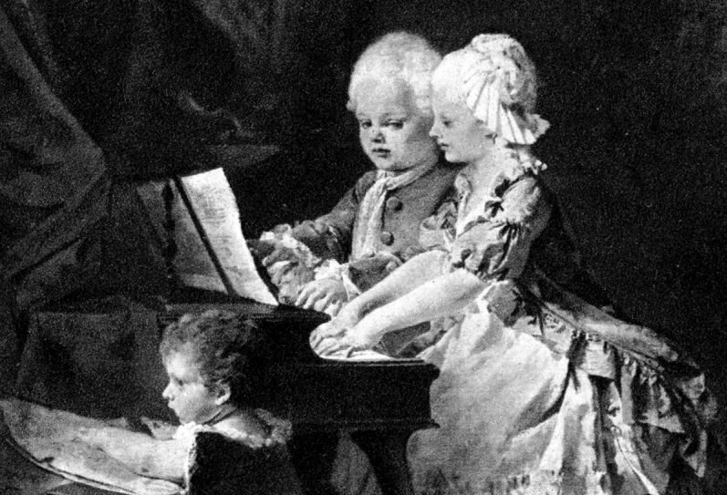 Motív z historickej pohľadnice zobrazujúci súrodencov Mozartovcov Wolferla a Nannerl. (zdroj: Zbierka Peter Janoviček)