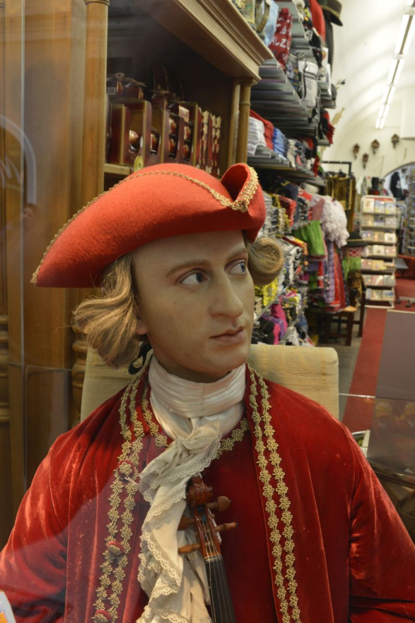 Figurína Wolfganga Amadea Mozarta vo výklade obchodu v jeho rodnom Salzburgu. (Autor: Robert Hofrichter)