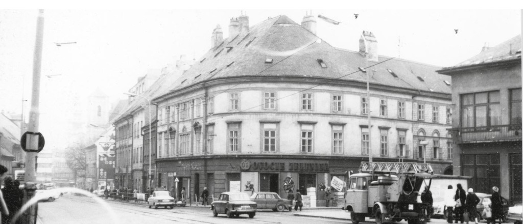 Das Eckhaus stand an der Ecke der Dürren Maut (Suché mýto) und der Konvent-Gasse; hier war ein Obst- und Gemüseladen, aber einst befand sich dort die Niederlassung der Steiner-Buchhandlung. (Diesen Teil der Konvent-Gasse und der Dürren Maut gibt es nicht mehr, an seiner Stelle ist eine Unterführung; fast alle Gebäude in der Richtung vom Michaeler-Tor wurden auch abgerissen). Auf der rechten Seite der Abbildung sieht man das bis heute bestehende Astoria- Gebäude.