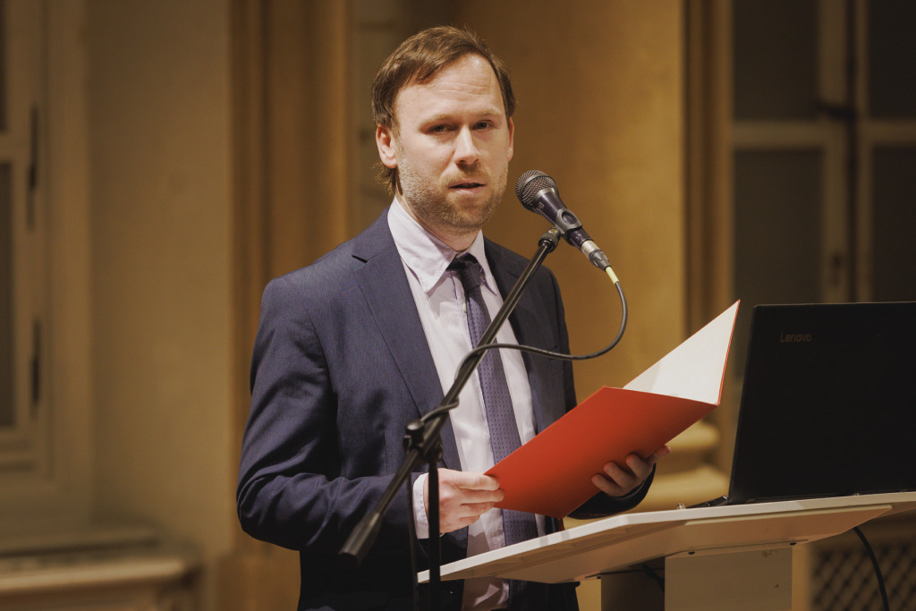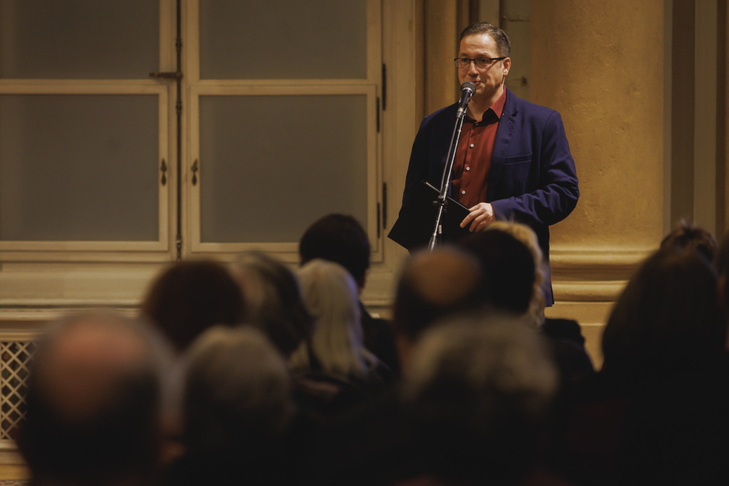 Slávnostný program moderoval náš podpredseda Arpád Korpás a jeho prvým bodom bola fundovaná prednáška rovnako podpredsedu nášho združenia Jána Vyhnánka na tému „Významné návštevy Zrkadlovej siene (s dôrazom na medzivojnové obdobie)".