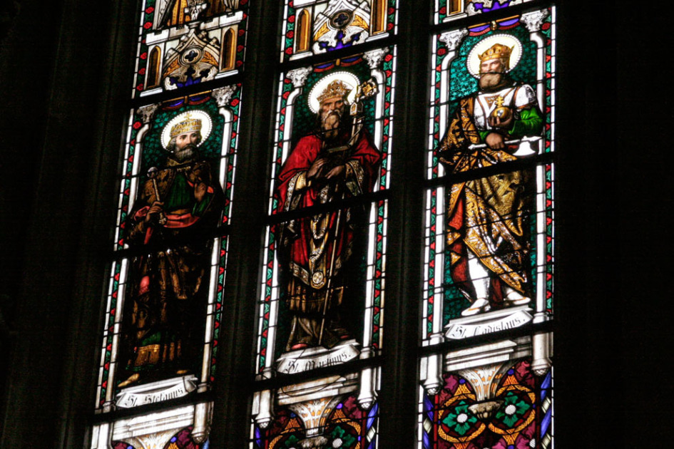 Svätí Štefan, Martin a Ladislav z vitráže dohliadajú na poriadok v chráme.