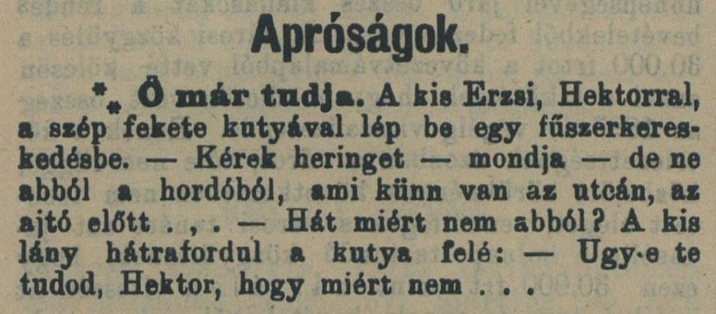 On už vie. Malá Alžbetka vstúpi s pekným čiernym psom Hektorom do obchodu s koloniálnym tovarom. „Prosím si haringa,“ povie, „ale nie zo suda, čo je na ulici pred dverami…“ „A prečo nie z toho?“ Dievčatko sa obráti na psa: „Ty už vieš, Hektor, prečo, však…“