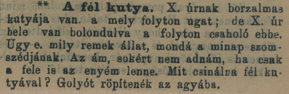 "Polka psa. Pán X. má strašného psa, ktorý bez prestania šteká; ale pán X. je do večne štekajúceho psa zbláznený. „Len sa pozrite, aké je to zviera úžasné,“ hovorí v ktorýsi deň svojmu susedovi. „Veru je, a za veľa by som ho nedal, keby mohla byť aspoň polka z neho moja.“ „Čo by ste robili s polkou psa?“ „Strelil by som mu guľku do hlavy.“