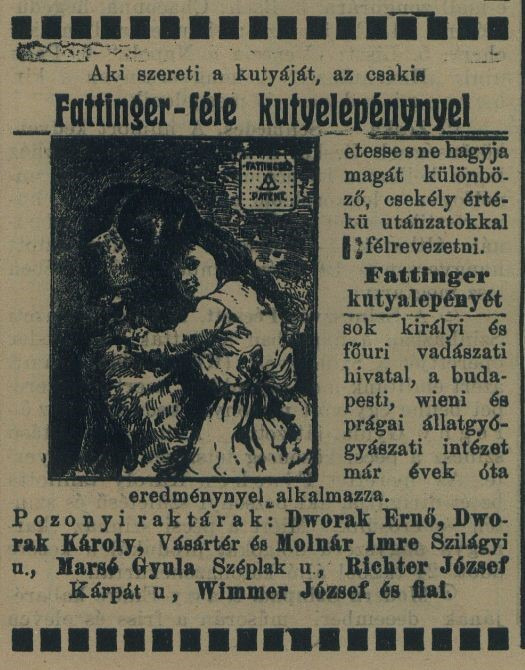 "Kto má rád svojho psa, nech ho kŕmi výlučne Fattingerovou plackou pre psy a nenechá sa oklamať rôznymi lacnými napodobeninami. Fattingerovu placku pre psy už roky úspešne používajú mnohé kráľovské a veľkopanské poľovnícke úrady a veterinárne ústavy v Budapešti, vo Viedni a v Prahe. Sklady v Prešporku: Ernest Dworak, Karol Dworak Trhové námestie a Imre Molnár Szilágyiho u., Július Marsé Schöndorfská u., Jozef Richter Karpatská u., Jozef Wimmer a synovia."