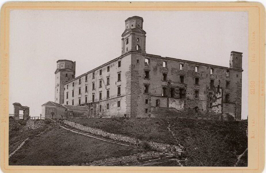 Na fotke vidno pár príslušníkov 16. kompánie cisárskej armády. Zaujimavým faktom je bielym písmom napísaný rok 1891 na strážnici, ale aj viditelné napojenie niekdajšej budovy Tereziana na východnej stene hradu.