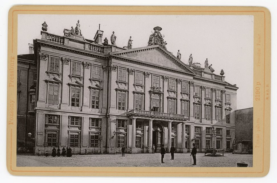 Budova paláca je krásnym príkladom klasicistickej architektúry, ktorá vznikla v rokoch 1778 – 1781. Na jej mieste sa už od stredoveku nachádzal hospodársky dom ostrihomského arcibiskupa. Arcibiskup však dlho v paláci nepobudol, už v roku 1820 sa presťahoval späť do Ostrihomu a palác začal chátrať. Istý čas tu bol dievčenský učiteľský ústav, škola a až v roku 1903 bola budova odkúpená od cirkvi pre potreby rozšírenia Starej radnice. Palác bol dejiskom mnohých významných udalostí, jednou z najvýznamnejších bolo podpísanie tzv. Bratislavského mieru v roku 1805, keď sa v Zrkadlovej sieni stretli zástupcovia rakúskej a francúzskej diplomacie a podpismi spečatili Napoleonovo víťazstvo v bitke pri Slavkove.