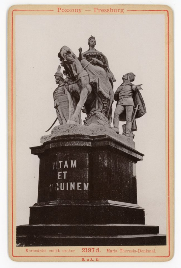 V roku 1774 Mária Terézia rozhodla a postavení novej krajinskej sýpky (na mieste dnešnej Reduty, (bližšie tu: https://barozky.sk/posledne-dni-schuttkasten/), kde sa nachádzal ešte stále starý Korunovačný pahorok. Rozhodla o jeho premiestení, pričom využila služby dvorného architekta Františka Antona Hillebrandta, ktorý navrhol krásnu neskorobarokovú kamenú konštrukciu vo forme troch šikmých rámp spájajúcich sa na vrchole pahorku, kde panovník dokončil svoju korunovačnú procesiu. Posledná korunovácia sa odohrala v roku 1830, vtedy na pahorok vyšiel posledný kráľ korunovaný v Prešporku, Ferdinand V., a ukončil stáročnú ceremoniálnu funkciu pahorku. Ako nepotrebný relikt na zašlú slávu bol pahorok rozobraný v roku 1870 s tým, že na jeho mieste bude postavená adekvátna náhrada. Prešlo 27 rokov a 16. 5. 1897 sa prísľub stal realitou. Za prítomnosti cisára a kráľa Františka Jozefa I. bolo odhalené verejnosti krásne súsošie z bieleho carrarského mramoru. Vyhotovil ho talentovaný a rodený Prešporčan Ján Fadrusz, ktorého bustu odhalili neskôr len pár metrov od pamätníka. Fadrusz akoby sa symbolicky pozeral na svoje monumentálne dielo. Na žulovom podstavci sa nachádzal nápis „Vitam et Sanguinem – Život a krv“. Je skrátenou formou výzvy členov uhorského snemu na pamätnom zasadnutí 11. decembra 1741 („Vitam et sanguinem pro rege nostro!“). Bolo to vyhlásenie uhorskej šľachty, že je pripravená obetovať za svoju kráľovnú aj vlastné životy. Žiaľ, prešlo len 24 rokov a pamätník 25. 10. 1921 zničili legionári novej, mladej Československej republiky. Sochu pomocou lán zvalili z podstavca, porozbíjali a časti pohádzali do vôd Dunaja, časť si odniesli ľudia a niektoré časti poslúžili ako materiál pri vzniku nových umeleckých diel. Viac o soche sa dočítate v tomto článku.
