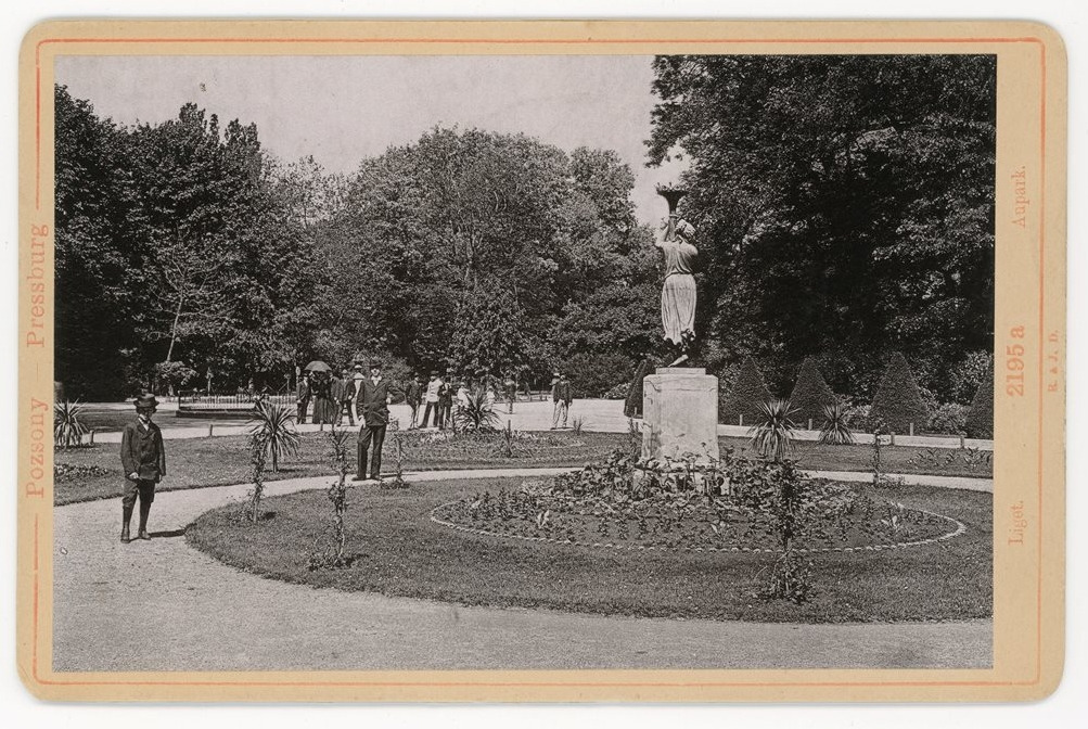 Časom park prešiel niekoľkými úpravami, posledná úprava, ktorú zachytáva aj táto fotografia pochádza z roku 1839. Drobné architektonické diela ako socha Flóry, ktorú na fotografii vidíme od chrbta, kamennú vázu alebo sochu Tritóna dal v roku 1868 postaviť Prešporský okrášľovací spolok. Neskôr sochu Tritóna nahradila socha nymfy Diany od sochára Antona Normana Brandla, ktorá od roku 1876 stála pred Grassalkovičovým palácom a v súvislosti so zavedením električkovej dopravy bola presunutá do parku. Dnes sa socha nachádza vedľa schodiska v Primaciálnom paláci.