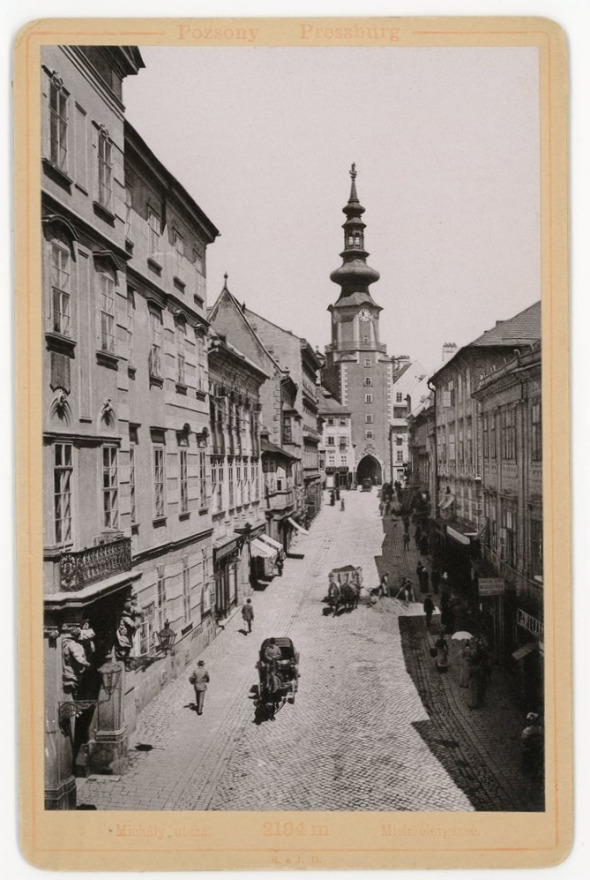 Opäť veľmi zaujímavý a pre fotografov mimoriadne obľúbený pohľad. Zachytáva relatívne čulý ruch v predpoludňajších hodinách na starobylej Michalskej ulici. Ústredným motívom je Michalská brána, resp. veža. Ide o jednu zo štyroch brán stredovekej fortifikácie mesta, ktorá sa dodnes zachovala, a to v podobe, v akej bola v roku 1758 odhalená po náročnej rekonštrukcii a prestavbe. Počiatky výstavby brány siahajú do záveru 14. storočia. Brána bola niekoľkokrát nadstavaná, čím reflektovala na vývoj vojenskej techniky a hroziace nebezpečenstvá, v prvom rade osmanskú hrozbu, keď bolo zbúrané rozsiahle územie s kostolom a cintorínom sv. Michala, ktorý sa nachádzal práve pred touto bránou. Ako som už spomínal, keď sa pominula hrozba zo strany Osmanov, dala vtedajšia panovníčka Mária Terézia príkaz na asanáciu mestských hradieb a ich veží z dôvodu rozširovania mesta a jeho narastajúcej populácie. S asanáciou sa začalo v roku 1775 a Michalská brána ako jediná prežila túto modernizáciu, a to z čisto z praktického hľadiska. Bránu totiž pred 17 rokmi nákladne prestavali v barokovej podobe a stala sa symbolom a okrasou mesta. Rozhodnutie o jej ponechaní ju zachránilo a my sa aj dnes, rovnako ako súdobý občan na konci 19. storočia, môžeme kochať jej nevídanou krásou. Len pred pár mesiacmi prešla kompletnou rekonštrukciou, ktorá jej navrátila podobu z roku 1758. Zaujímavosťou je fakt, že v minulosti veža nemenila len tvar, ale aj farbu. Po jej barokizácii v 18. storočí bola veža, tak ako aj iné stavby v Prešporku, natretá bielou vápennou farbou. V tej dobe neexistovali trvácne pigmenty, ktoré by odolali poveternostným vplyvom. Zmenilo sa to až koncom 19. storočia. Vtedy sa vedenie mesta rozhodlo staručkú vežu oživiť a prefarbilo ju na okrovočervenú. Toto farebné prevedenie vidíme aj na tomto zábere. K opätovnému návratu k bielej farbe došlo až v 30. rokoch 20. storočia.