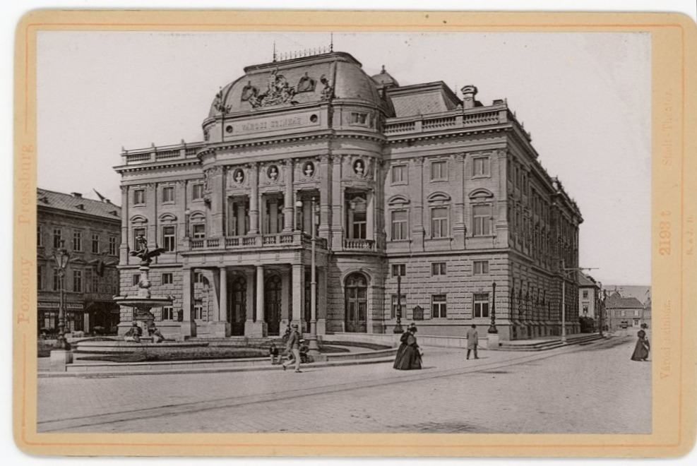 Fotografia zachytáva čelný pohľad na Városi színház (Mestské divadlo), teda dnešnú Historickú budovu Slovenského národného divadla. Priestranstvo, na ktorom stojí táto krásna eklektická budova, bolo v minulosti vodnou priekopou. V severnej časti námestia prebiehala až do 80. rokov 18. storočia južná línia mestského opevnenia. Keď pominula osmanská hrozba sa v dôsledku rozrastania mesta začali búrať už nepotrebné hradby, zasypávať a vyrovnávať priekopu a stavať nové budovy. Šírka priekopy mala úctyhodných 40 metrov a začínala pri vyústení Hviezdoslavovho námestia do Rybného námestia a končila pri Štúrovej ulici. Ako jediná časť priekopy, ktorá obkolesovala mesto a hradby, bola naplnená vodou, dokonca sa v niektorých jej častiach chovali ryby. V minulosti cez námestie pretekalo aj jedno z mnohých ramien Dunaja, ktoré bolo v miestach pred divadlom premostené dreveným mostíkom. V roku 1781 sa vedenie mesta rozhodlo priekopu zasypať paralelne s búraním hradieb na príkaz Márie Terézie a vysadiť štyri rady stromov. Kvôli nekvalitnej navážke boli vysadené odolné agáty. Napriek tomu sa v novom parku počas silnejších dažďov vytvárali mláky. Honosnejšia úprava námestia sa začala až v roku 1911, keď bol celý park obohnaný kovaným plôtikom, pribudli lavičky, prútené ochranné koše okolo stromov, krásny secesný meteorologický pavilón, ako aj vtáčia fontánku z roku 1915, ktorú darovala firma Stollwerck. V roku 1887 bol pred divadlom odhalený pomník hudobníkovi Johanovi Nepomukovi Hummelovi, avšak už v roku 1911 ho vystriedalo Petöfiho súsošie. Čo sa týka samotného divadla, tak jeho predchodcom bol taktiež kultúrny stánok, išlo o Csákyho divadlo postavené v roku 1776 pred zbúranou Rybárskou bránou, ktorej časti boli sekundárne použité pri výstavbe divadla. V 80. rokoch 19. storočia už divadlo nevyhovovalo vtedajším protipožiarnym predpisom, tak sa následne pristúpilo k jeho demolácii.