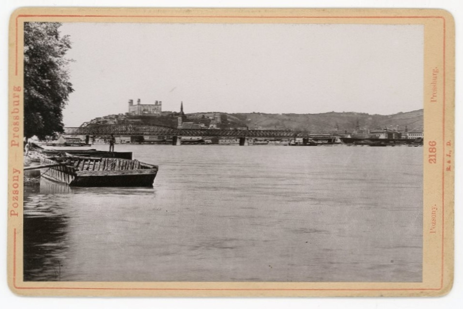 Klasický pohľad na panorámu Bratislavy z petržalskej strany. V strede záberu je ešte len šesť rokov starý Most Františka Jozefa I. (dnešný Starý most). Nad ním sa týči ruina hradu, ktorý vyhorel 28. mája roku 1811 a veža Dómu sv. Martina po neogotickej úprave (začala sa v roku 1865). Vďaka tejto snímke vieme s určitosťou datovať rok fotografovania. Po priblížení, detailnom skúmaní a porovnávaní vidíme na dnešnom Námestí Ľudovíta Štúra dočasnú drevenú stavbu, ktorá slúžila pri stavbe pamätníka Márie Terézie. Jednotlivé kusy tam previezli z dielne Jána Fadrusza na vozíkoch po koľajach. Umelec mohol v drevenom prístreší pracovať na monumentálnom diele z bieleho mramoru aj za nepriaznivého počasia a nerušili ho pritom žiadni zvedaví diváci.
