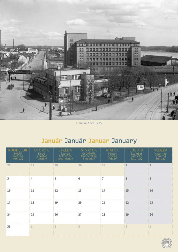 Scenéria, akú vidíme na obrázku kalendára v januári, sa naskytala z dnešnej budovy Univerzity Komenského na Šafárikovom námestí niekedy okolo roku 1935. Teda v čase, keď budovu, stavanú podľa projektu Františka Krupku pôvodne pre Štátny obchodný dom v Bratislave, vtedajšia vláda pridelila Univerzite Komenského. Čiernobiely záber na križovatku Dostojevského radu a Pribinovej ulice urobil bratislavský fotograf Josef Hofer (1883 – 1967). Do digitalizovanej podoby bol prenesený zo skleneného negatívu, ktorý uchováva Archív mesta Bratislavy.