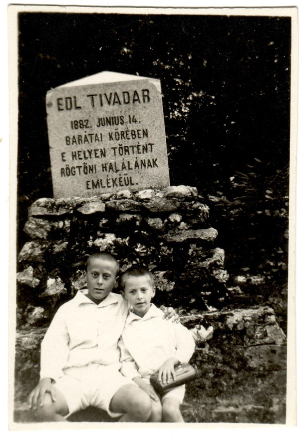 Géza a László Berthovci (môj otec a ujo), pravnúčatá Teodora Edla, pri pamätníku; 1928 (Archív autorky)