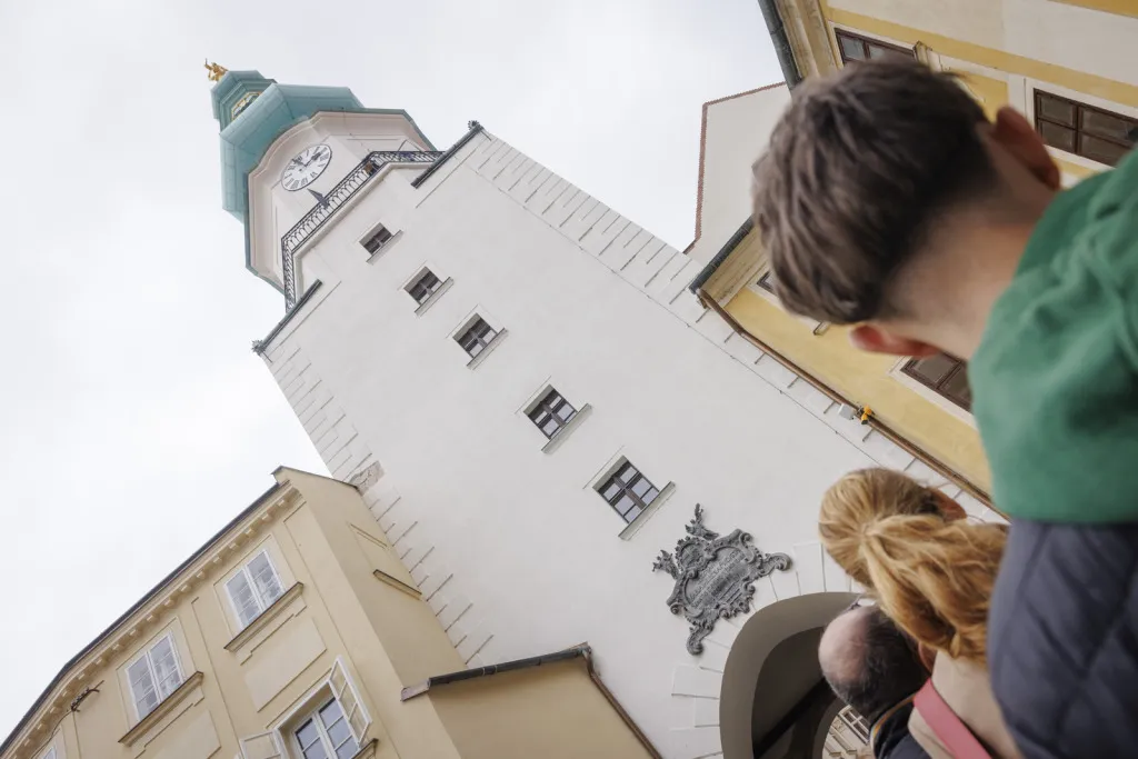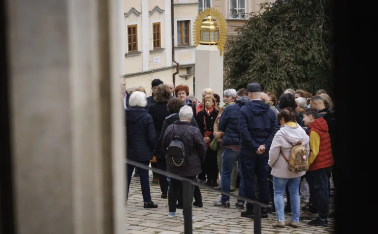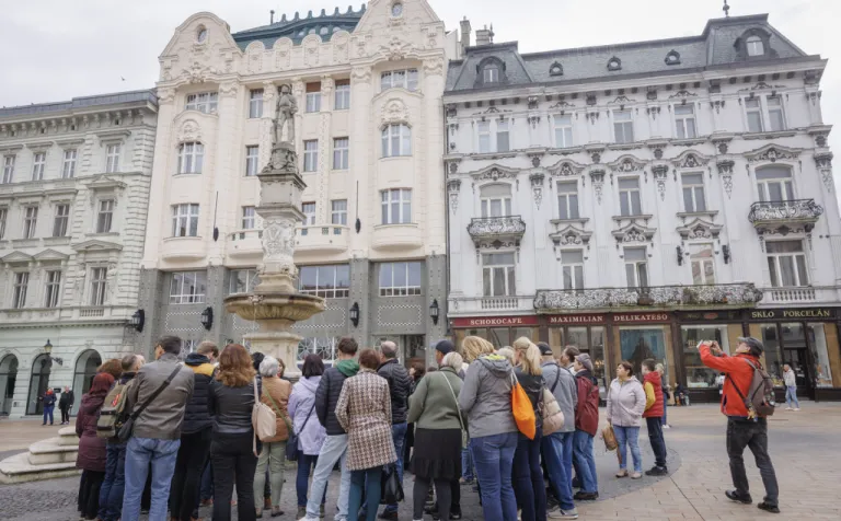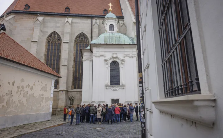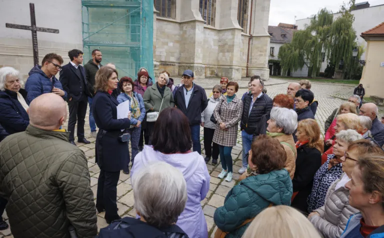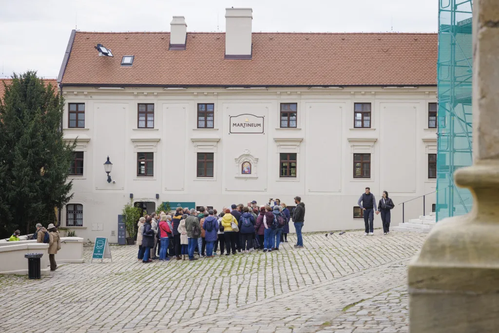 Bratislava (dobový Prešporok) bola korunovačným mestom Uhorského kráľovstva 270 rokov (v rokoch 1563 – 1830). Korunu nasadzovali na hlavy kráľov a kráľovien v Katedrále sv. Martina – a práve tu začala naša sprievodkyňa Beatrix Ordódy svoju prehliadku. Na Rudnayovom námestí, tiahnucom sa popri južnom múre katedrály, sme sa dozvedeli viac o replike Svätej koruny, ktorá zdobí vežu katedrály, ale aj o korune ako symbole objavujúcom sa na viacerých miestach svätyne.