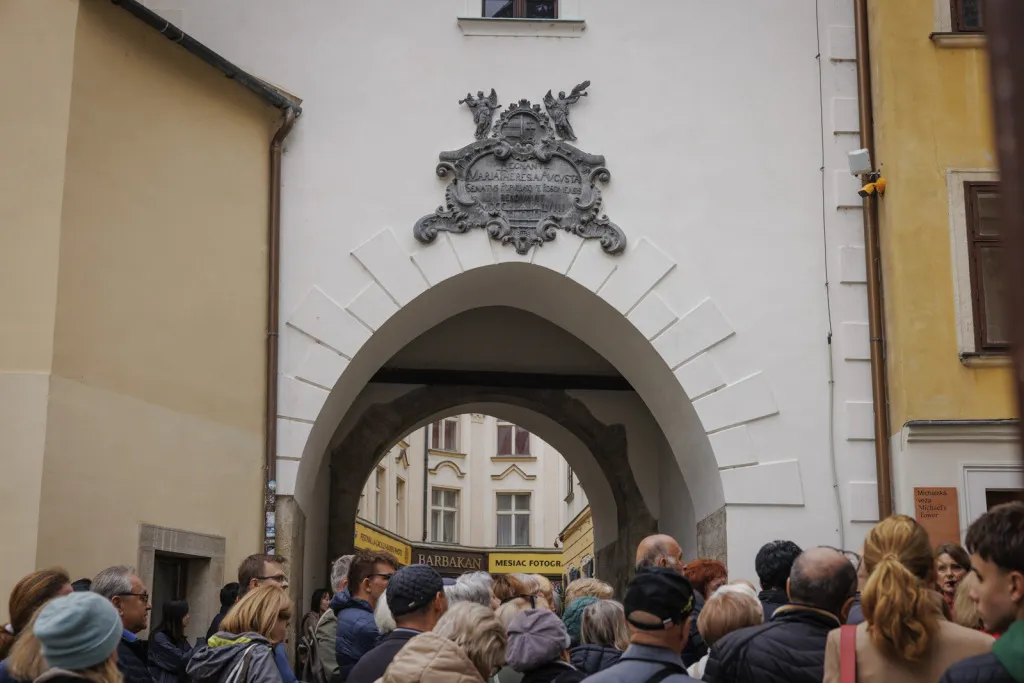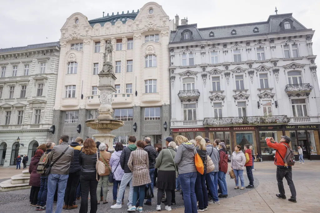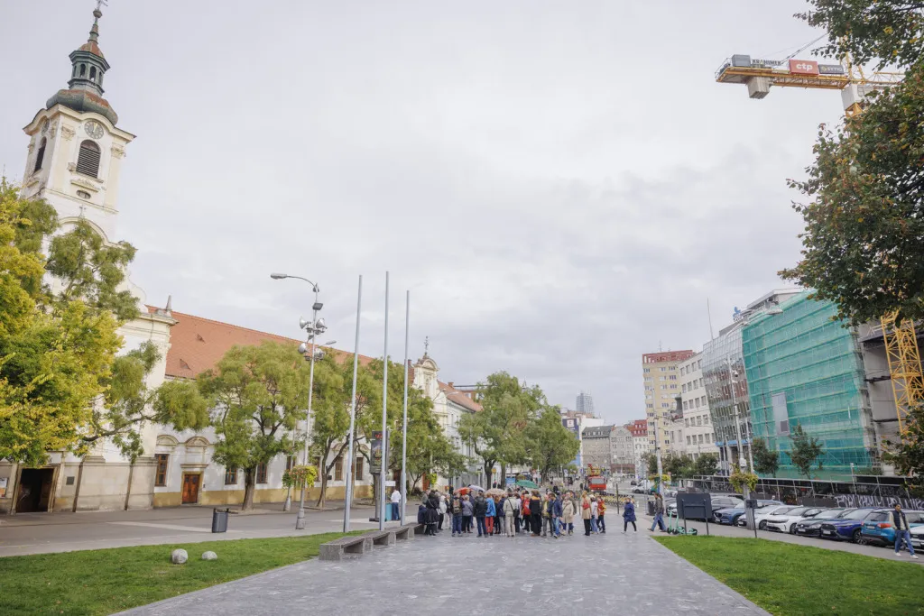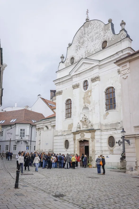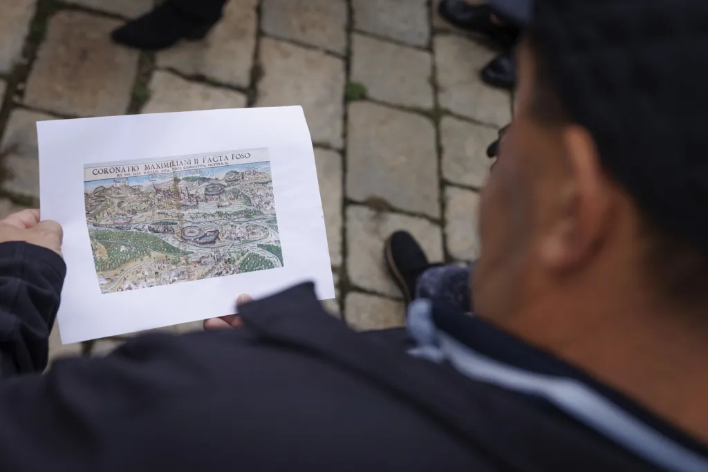 Následne sme absolvovali trasu pôvodného korunovačného sprievodu cez Kapitulskú, Ventúrsku a Sedlársku ulicu na Hlavné námestie, kde sme si pozreli fontánu zachytávajúcu kráľa Maximiliána I., prvého panovníka korunovaného v Prešporku. Prechádzku sme ukončili pred Kostolom Milosrdných bratov, kde sme si pripomenuli aj poslednú zastávku tohto historického obradu – niekdajší korunovačný pahorok, ktorý sa nachádzal pri Dunaji.