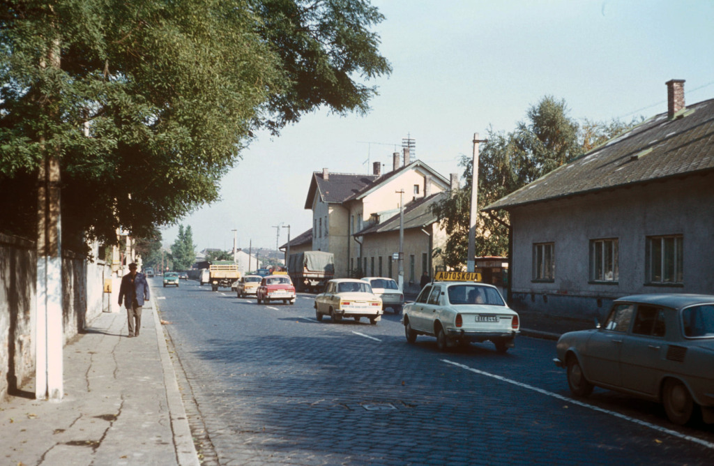 Opäť Karadžičova ulica s „malou stanicou“. Všimnime si, že osobné autá v pravom jazdnom pruhu sú samé škodovky.