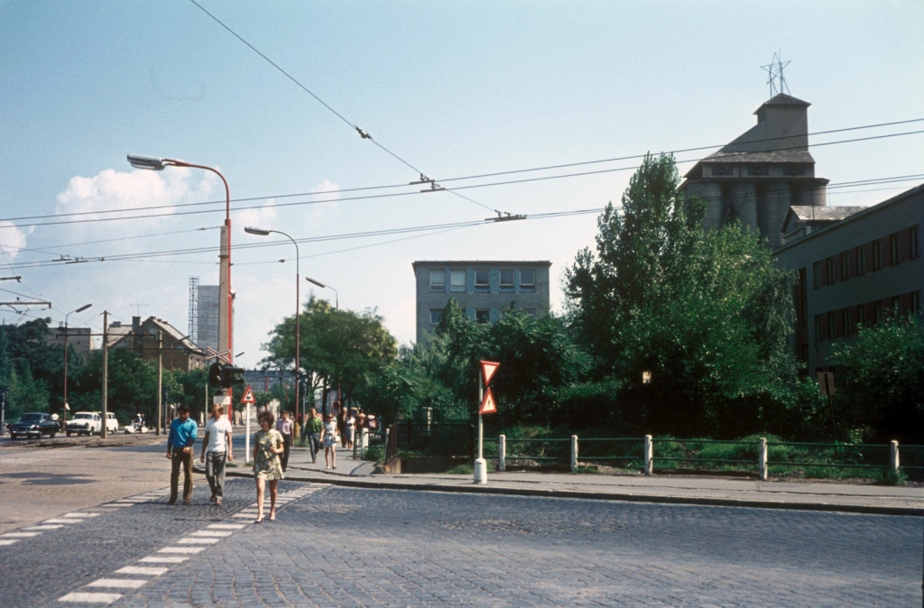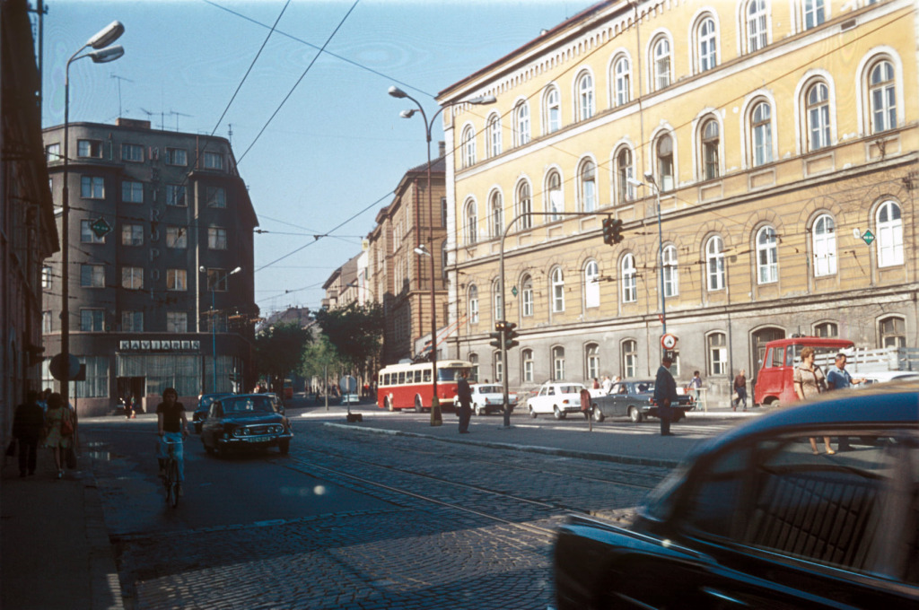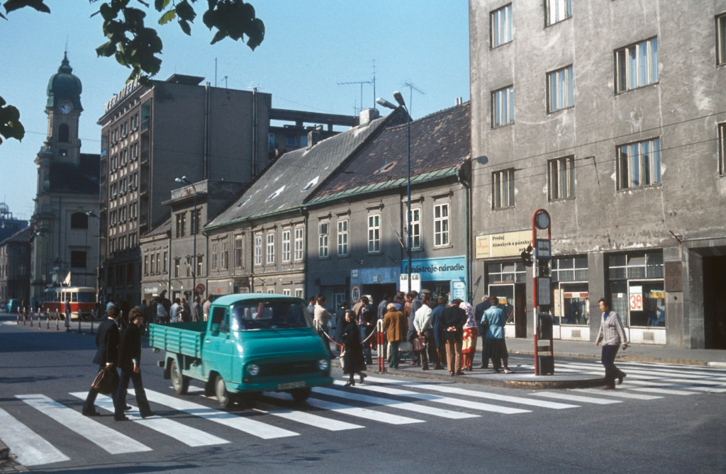 Túto kaviareň miestni vtipne nazývali aj Böži, lebo ju istý čas navštevovali tí, čo sa chceli zoznamovať. Vychádzal sem trolejbus, ktorý na predchádzajúcej fotografii zamieril na Mickiewiczovu ulicu, zatiaľ čo ulica, do ktorej vľavo odbočuje Škoda 1203, odvtedy zanikla. V pozadí ešte stoja staré budovy ohraničujúce Kollárovo námestie a Radlinského ulicu, z ktorých sa dodnes nezachovala ani jedna – s výnimkou práve rozostavanej STU v pozadí. Krátke rukávy a slnečné okuliare napovedajú, že fotka vznikla v lete.