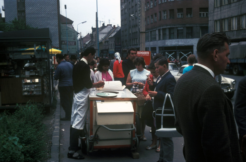 Rad na zmrzlinu na rohu Obchodnej a Poštovej ulice. Zdá sa, že muž v sandáloch priviezol iba jeden druh zmrzliny, pričom kornútky čakajú v natrhnutom papierovom vreci po jeho ľavej ruke. Zmrzlinový vozík vyrobil z káry a podložil ho mačacou hlavou, aby sa nepohol z miesta. V pozadí vidno reklamu na Cirkus Humberto; ak sa pozrieme ešte ďalej, všimneme si, že na prízemí rožného domu Palace nedávno vymenili sklené tabule, keďže sú prelepené páskou v tvare „X“.