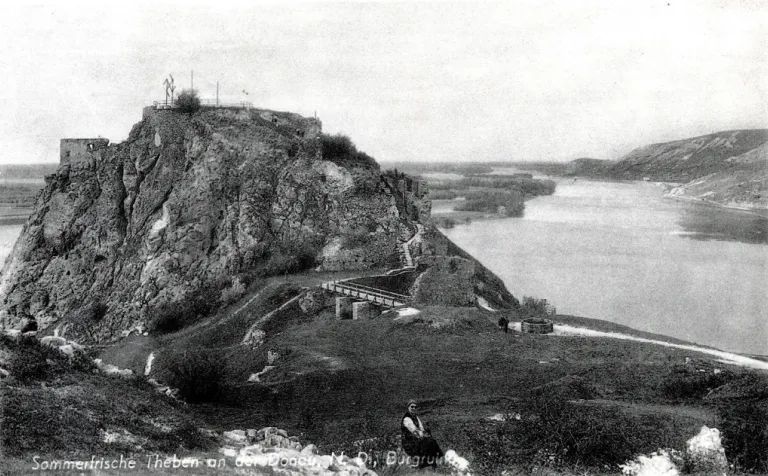 Drevený hákový kríž na vrchu ruiny hradu Devín. Dobová pohľadnica z čias 2. svetovej vojny, ktorá ...