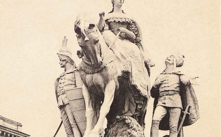 Po jej ľavici stojí uhorský šľachtic v slávnostnom odeve, ktorý má jednu ruku položenú na srdci a ...