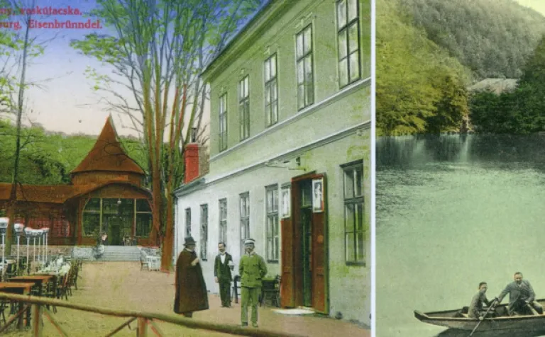 1. diel tu Hostinec na Železnej studienke spolu s Labutím pavilónom, na pohľadnici z obdobia okolo ...