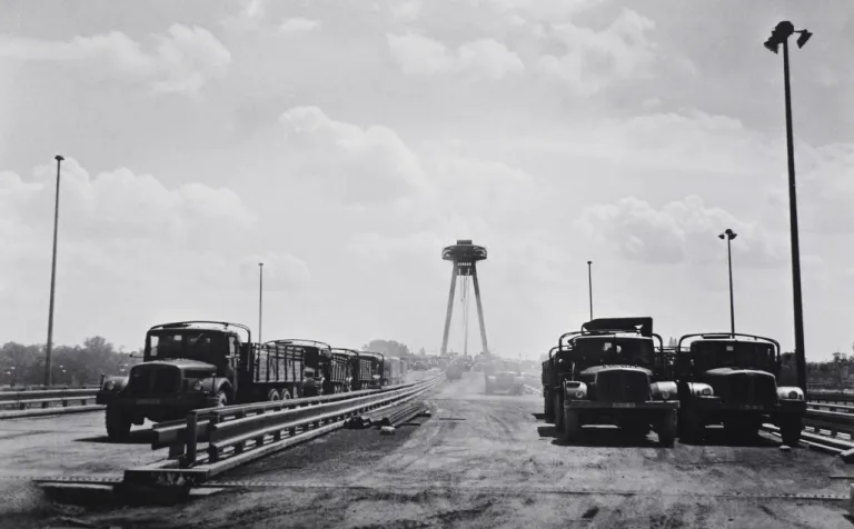 Viliam Malík: Zdemolovaný Štefánikov most ustupujúcou nemeckou armádou, 1945. Zdroj: Múzeum ...