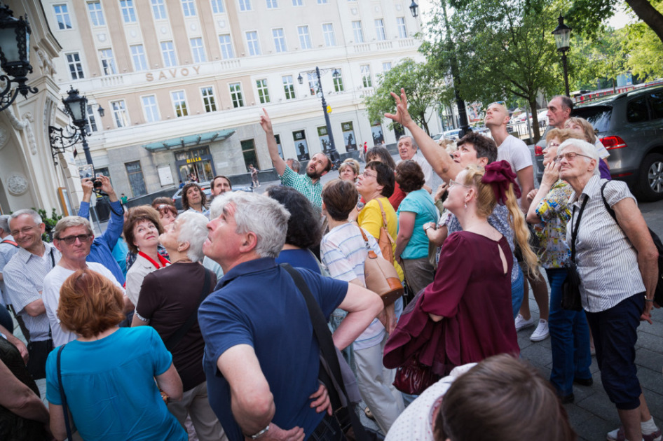 Účastníkov privítala dvojica sprievodcov: Juraj Adamuščin, pracovník vstupenkovej pokladnice SF a bývalý člen Slovenského filharmonického zboru, a Ján Vyhnánek, podpredseda OZ Bratislavské rožky a súčasne sprievodca zameraný na hudobnú históriu Bratislavy.