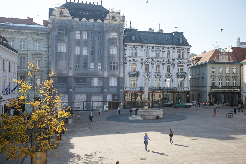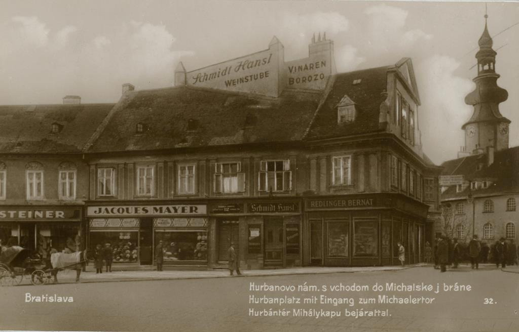 Na rohu Hurbanovho námestia a Michalskej ulice stál od roku 1829 klasicistický hostinec U krajinského palatína (neskôr známy ako Schmit-Hansl), medzi ktorého návštevníkov patrili napr. politik Lajos Kossuth či svetoznámy dirigent Hans Richter. Okrem hostinca sa v ňom od roku 1832 nachádzal jeden z najznámejších prešporských obchodov so súknom Zum Herrnhuter, ktorému dominoval firemný štít, znázorňujúci človeka v životnej veľkosti, oblečeného v pumpkách so sponkovými topánkami, na ľavom ramene s preloženým súknom. Jeho posledný majiteľ, podnikateľ s obuvou Tomáša Baťa, ho dal zbúrať a po určitých ústupkoch verejnosti (napr. zachovanie pohľadu na Michalskú vežu z Obchodnej ulice) dal na jeho mieste postaviť moderný obchodný dom (projekt Vladimír Karfík), ktorý bol slávnostne otvorený v posledný októbrový deň roku 1931.