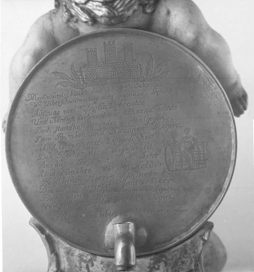 V zbierkach Múzea mesta Bratislavy sa zachovala jedinečná a zároveň aj kuriózna pamiatka spojená so spomínanými pohnutými vojnovými udalosťami roku 1809. Je ňou malý cínový súdok (rozmery: 20 x 20 x 30 cm) na nízkom drevenom podstavci (13 x 25 x 30 cm), zdobený na oboch koncoch gravírovanými nemeckými textami. Na súdku sedí odnímateľná soška sediaceho boha vína Bakcha, vyhotovená z vyrezávaného polychrómovaného a zláteného dreva (jej výška dosahuje 32 cm). Neznámy rezbár vytvoril postavičku s niektorými výrazne preexponovanými časťami tela – najmä vystupujúcim bruchom a krátkymi tučnými nohami. Na hlave a okolo bedier má pozlátený vavrínový veniec – dávny symbol víťazstva.