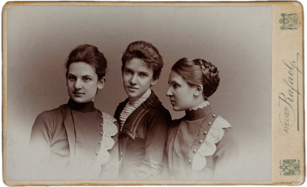 Tri z piatich dcér podnikateľa Bartelmusa. Dvojičky a Božena, ktorá sa stala manželkou D. S. Jurkoviča. Fotografia z roku 1901. Zdroj: Rodinný archív Kataríny Salayovej