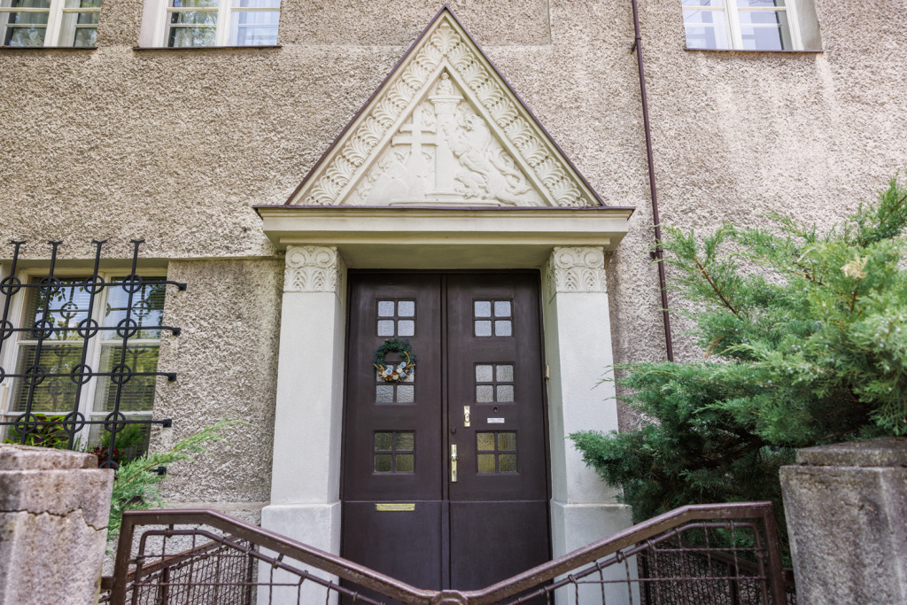 Vchod do Jurkovičovej vily na Lermontovovej 23. Na priečelí nad vchodom vidno českého leva. Foto Braňo Bibel