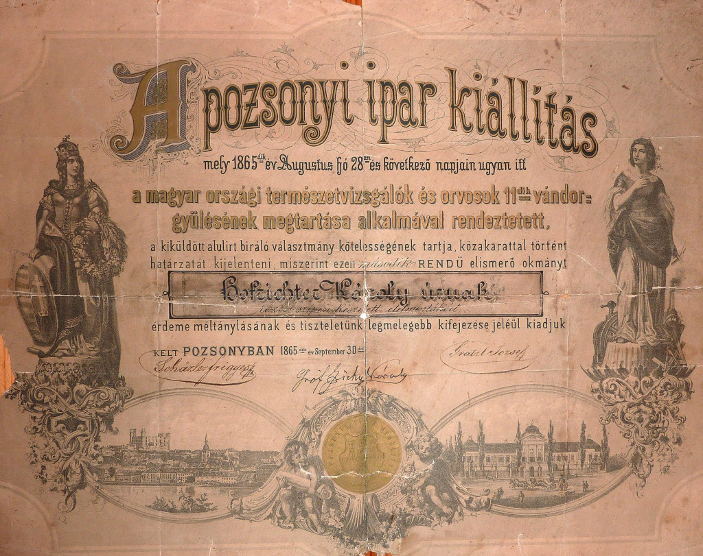 Diplom z roku 1865, udelený na Prešporskej priemyselnej výstave Katkinmu dedovi Karolovi Hofrichterovi. Jeho zlatnícka firma sa zúčastnila aj na pozlátení koruny z Katedrály sv. Martina v roku 1905.