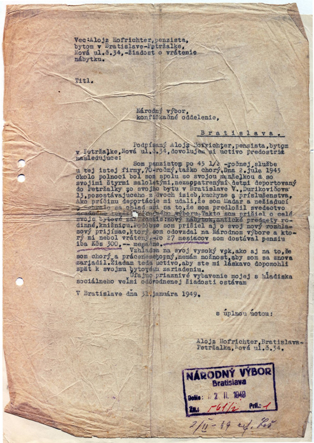 Dokument, ktorým sa otec Hofrichter snažil v roku 1949 získať späť zariadenie ich bratislavského bytu. Rodina svoj majetok však naspäť nikdy nedostala.